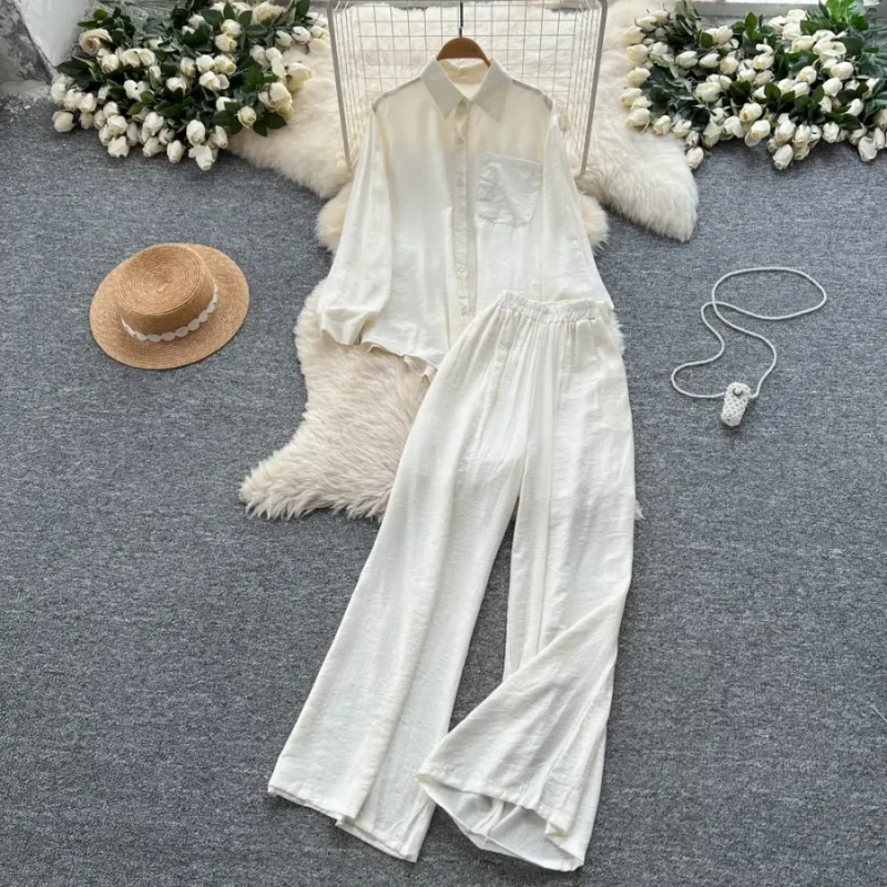 Lazy Style Casual Two-Piece Set for Women: Loose Fit, Versatile Pocket Design, Long-Sleeved Shirt, High-Waisted Wide-Leg Straight-Leg Pants