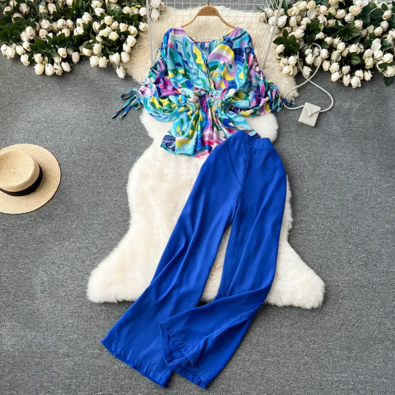 High-waisted wide-leg pants and fashionable two-piece suit