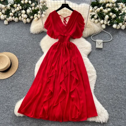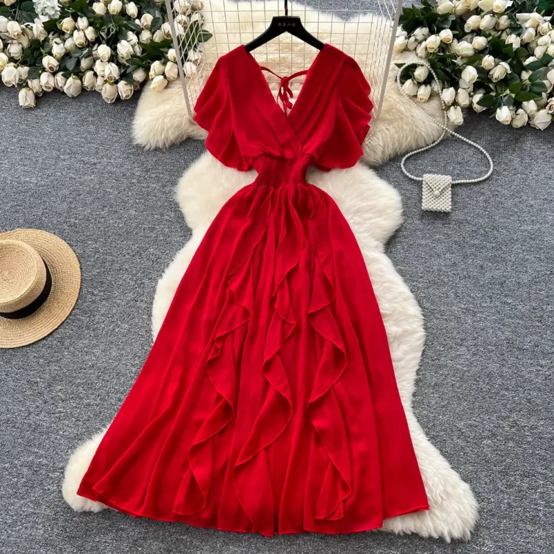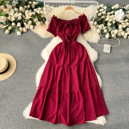 French-style dress, elegant and gentle, off-the-shoulder, puff sleeves, waist-cinching, slimming, fairy-like, sweet vacation dress