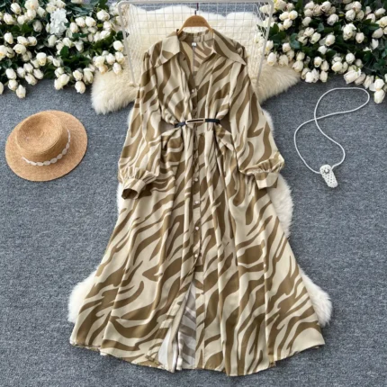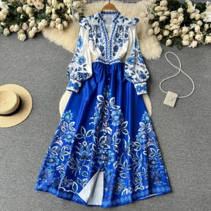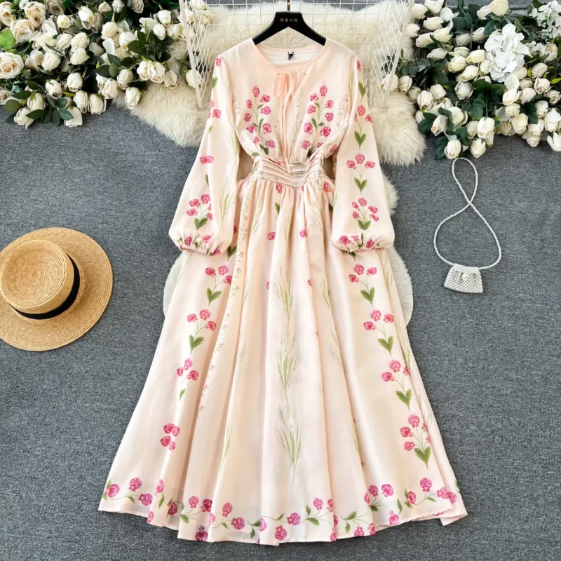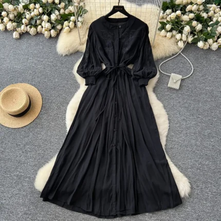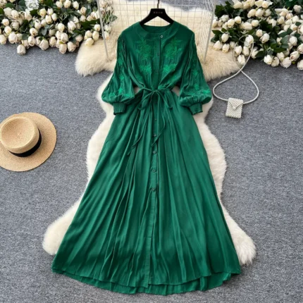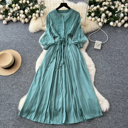 Tie-waist, single-breasted, slimming, elegant long dress with rose embroidery.