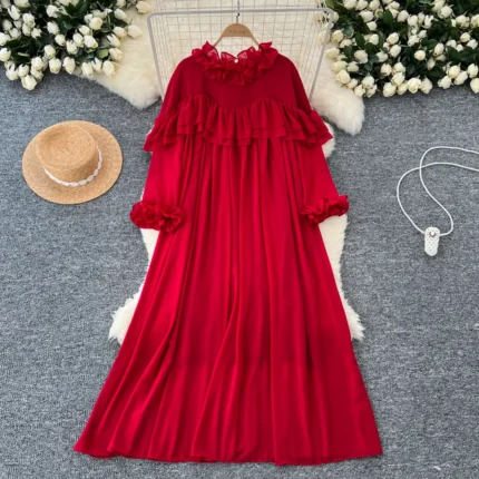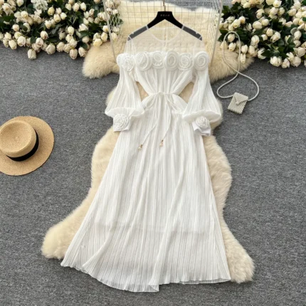 French high-end three-dimensional flower mesh splicing long-sleeved waist pleated dress