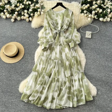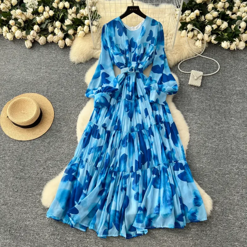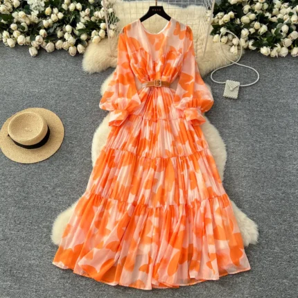 Pleated Long Printed Chiffon Dress, Sweet Vacation Dress