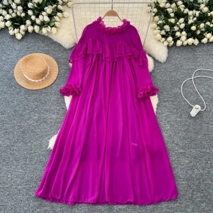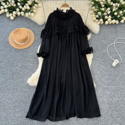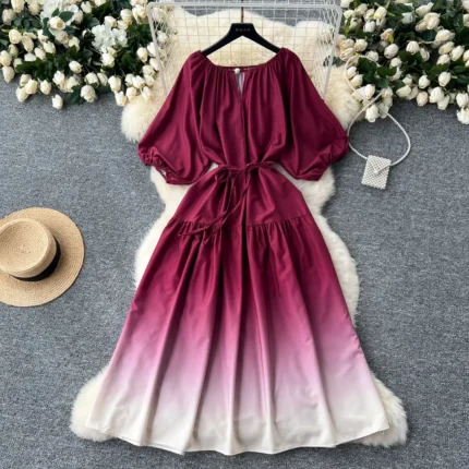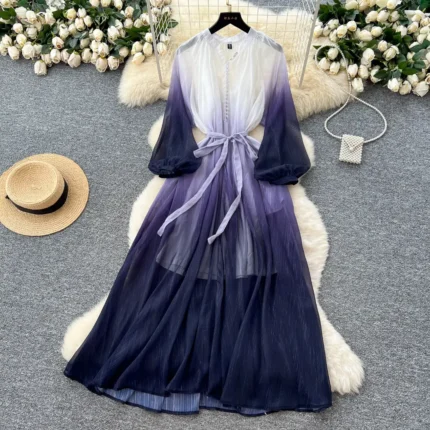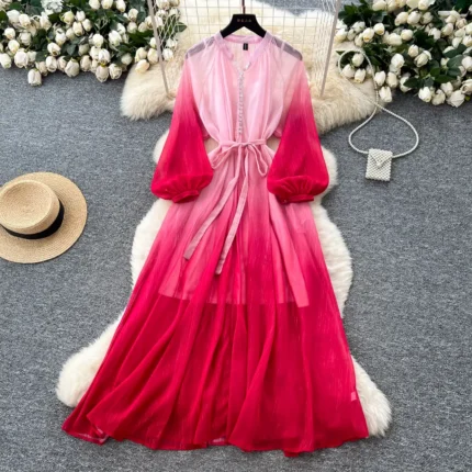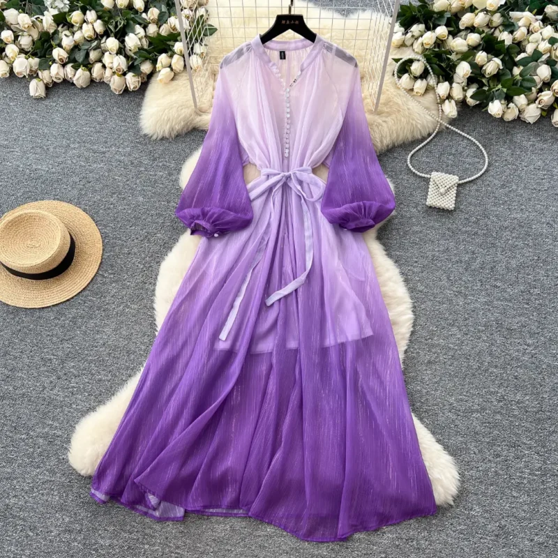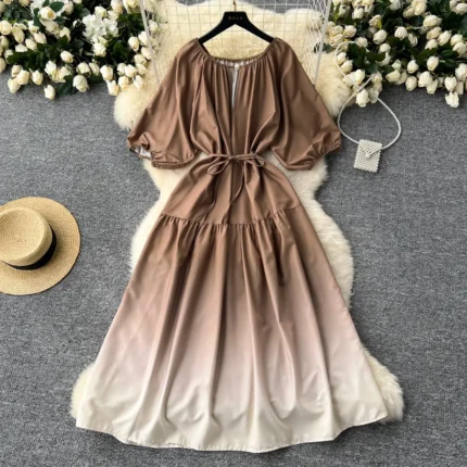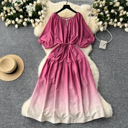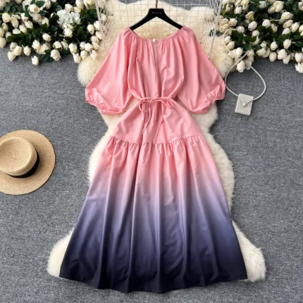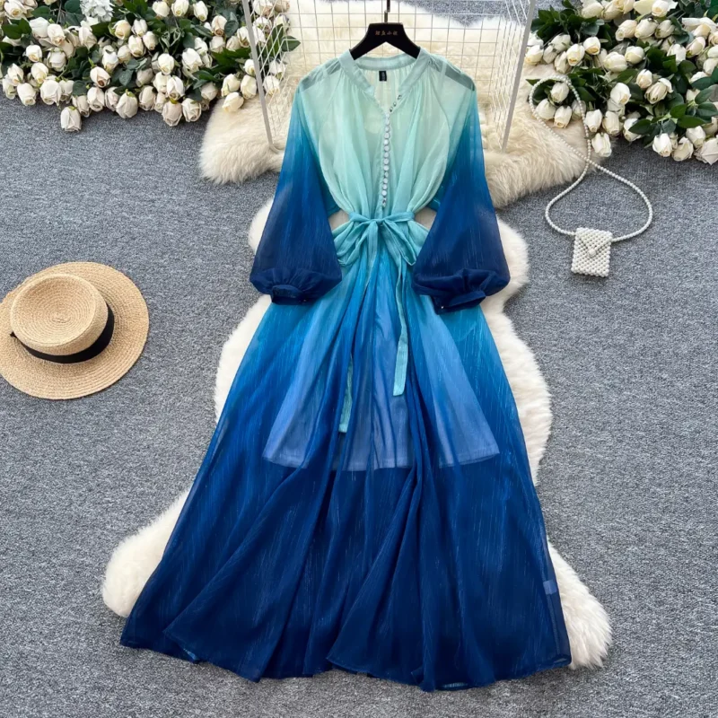 Hollow round neck lantern sleeve waist waist gradient long skirt