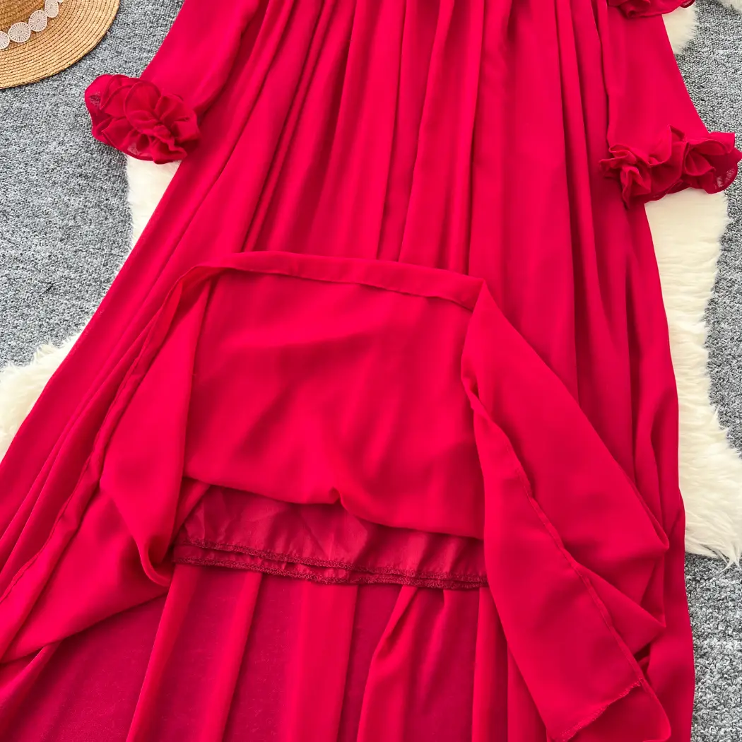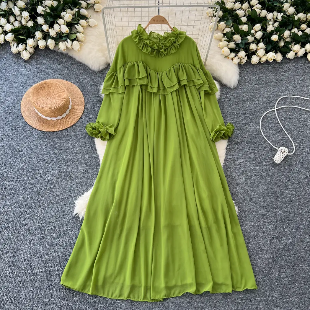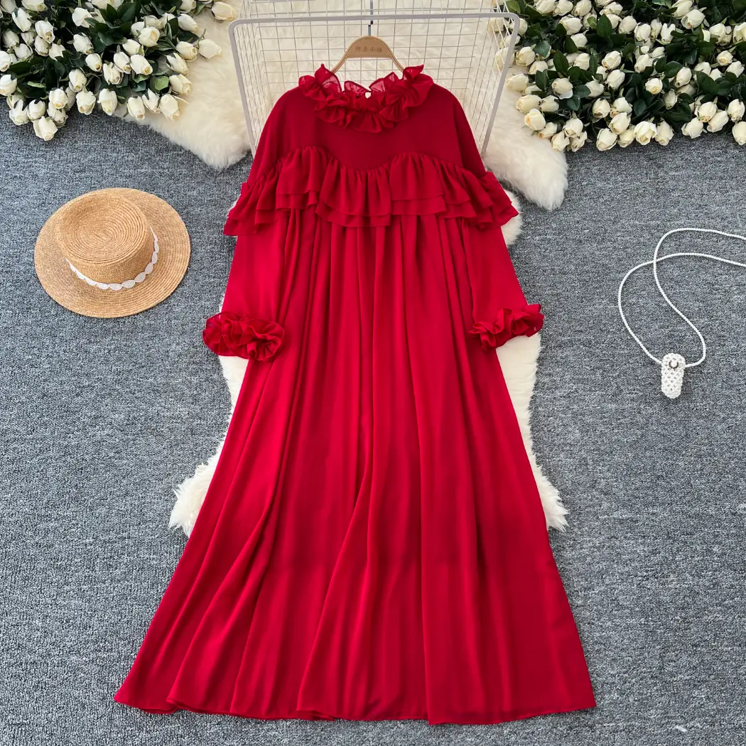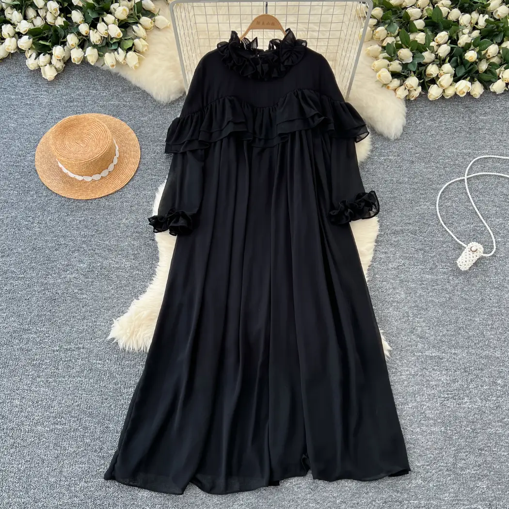 Autumn Fashionable and Elegant Women’s Dress with French Design, Ruffled Trim, Loose Fit, Slimming Chiffon Long Dress
