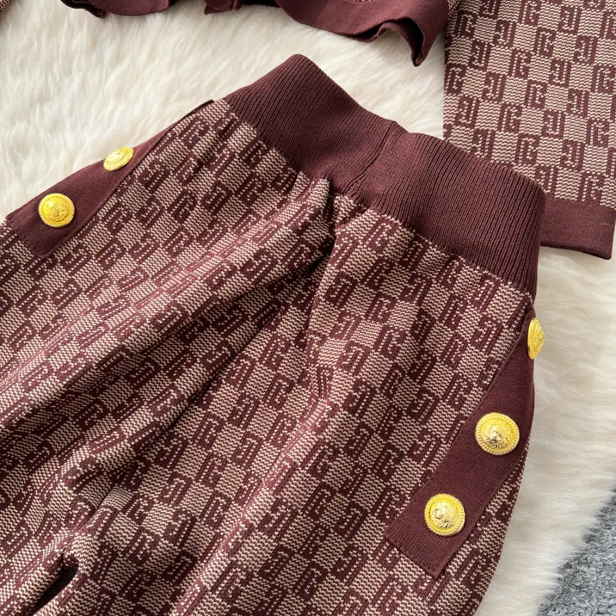 European-style chic and sophisticated two-piece set: round neck long-sleeved knit top with metal buckle and high-waisted wide-leg pants.