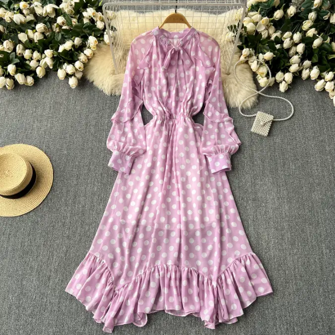 Be the first to review “Flowy, high-end European and American style polka dot chiffon dress with a French tie-waist design” Cancel reply