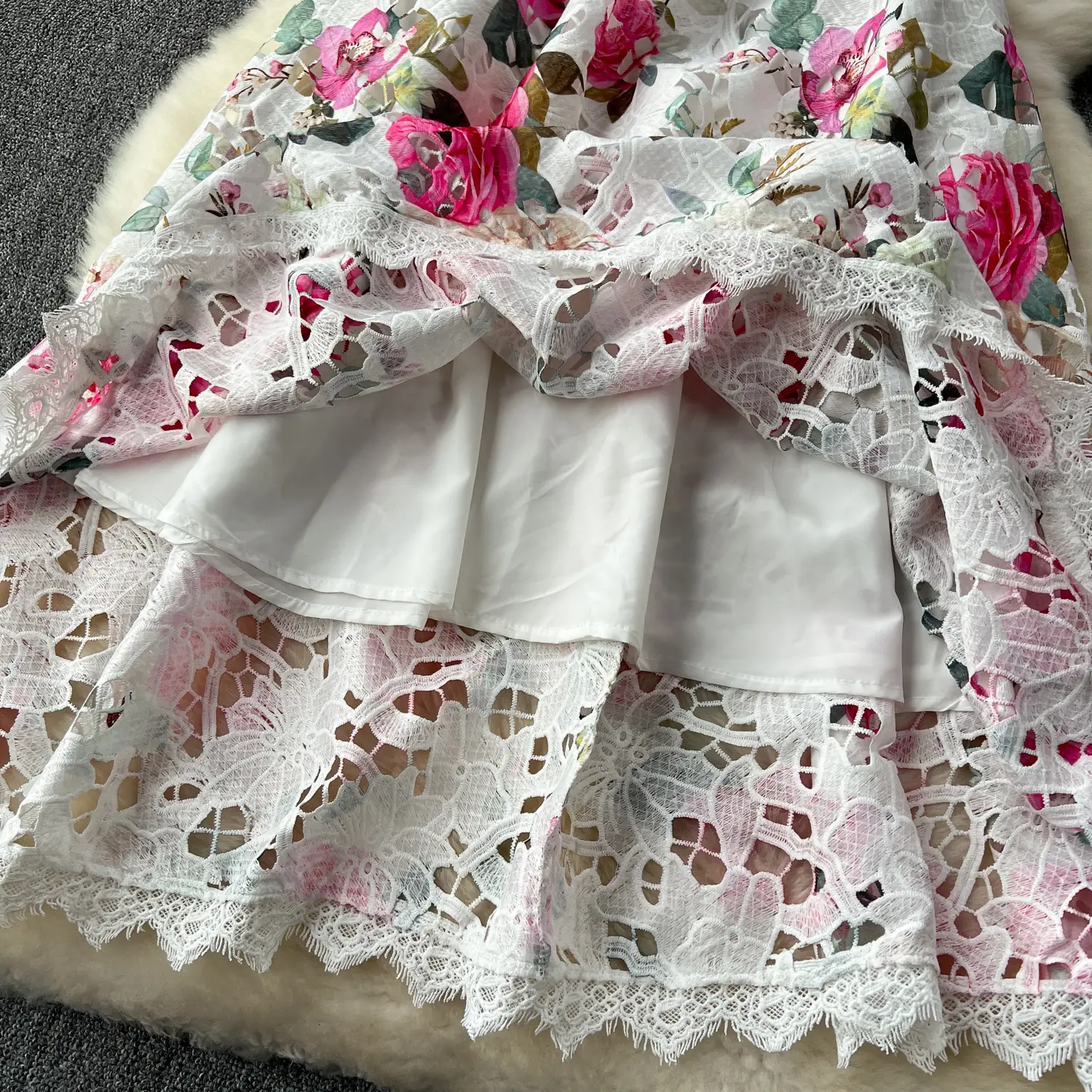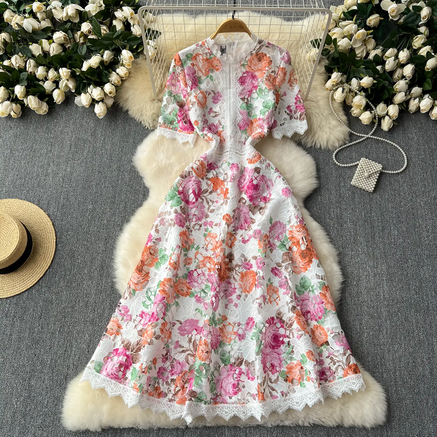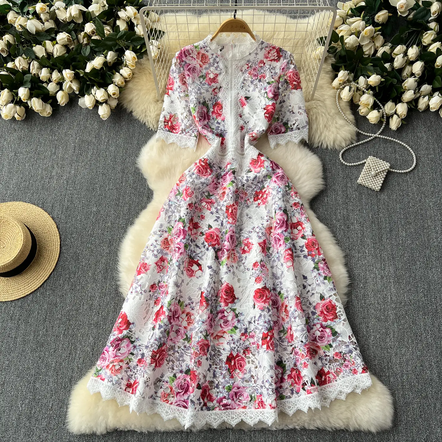 French retro elegant lace splicing printed waist-cinching elegant dress