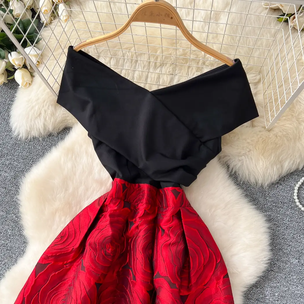 Be the first to review “One-shoulder patchwork waist jacquard large swing puffy dress” Cancel reply