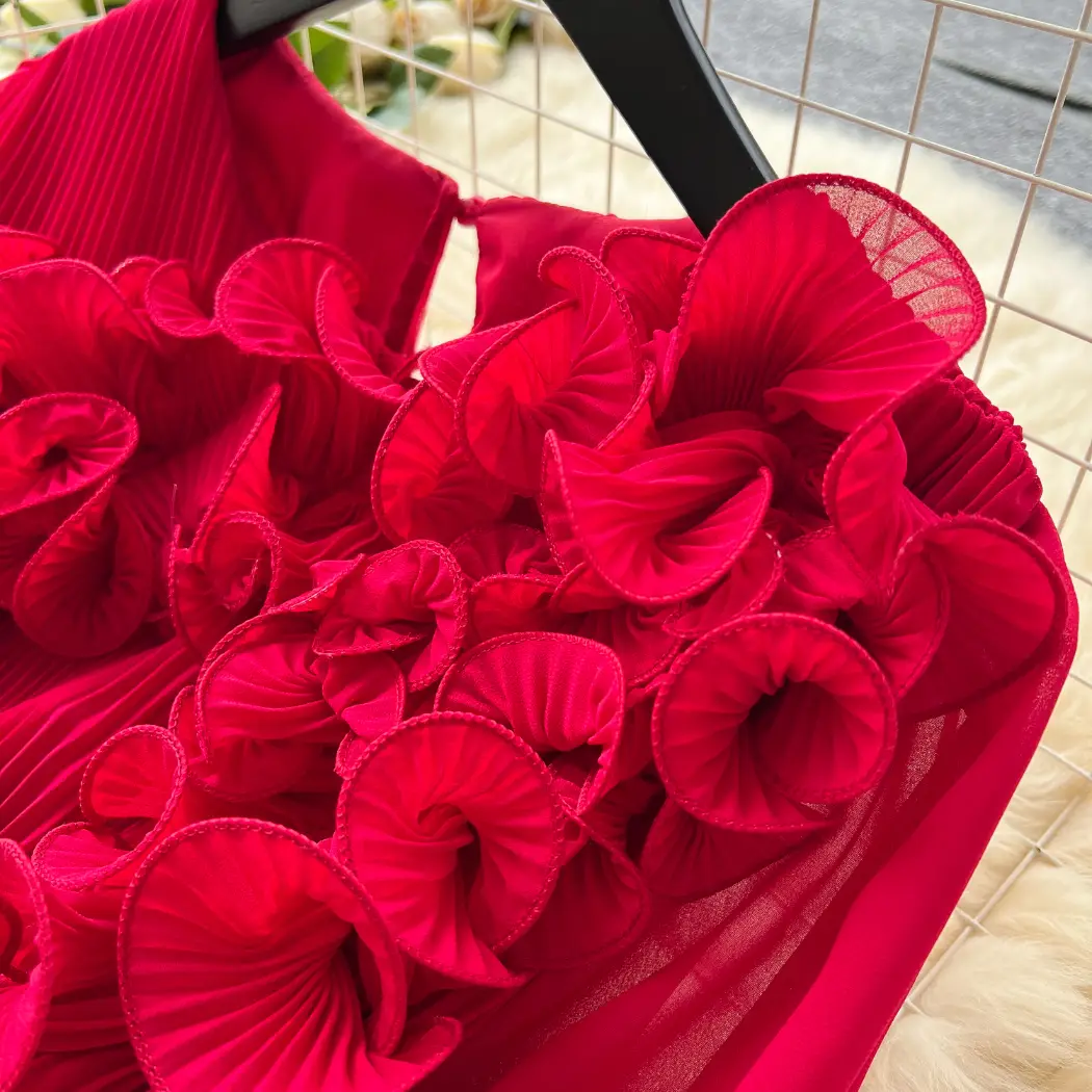 Three-dimensional lace lantern sleeve strap waist slimming pleated dress