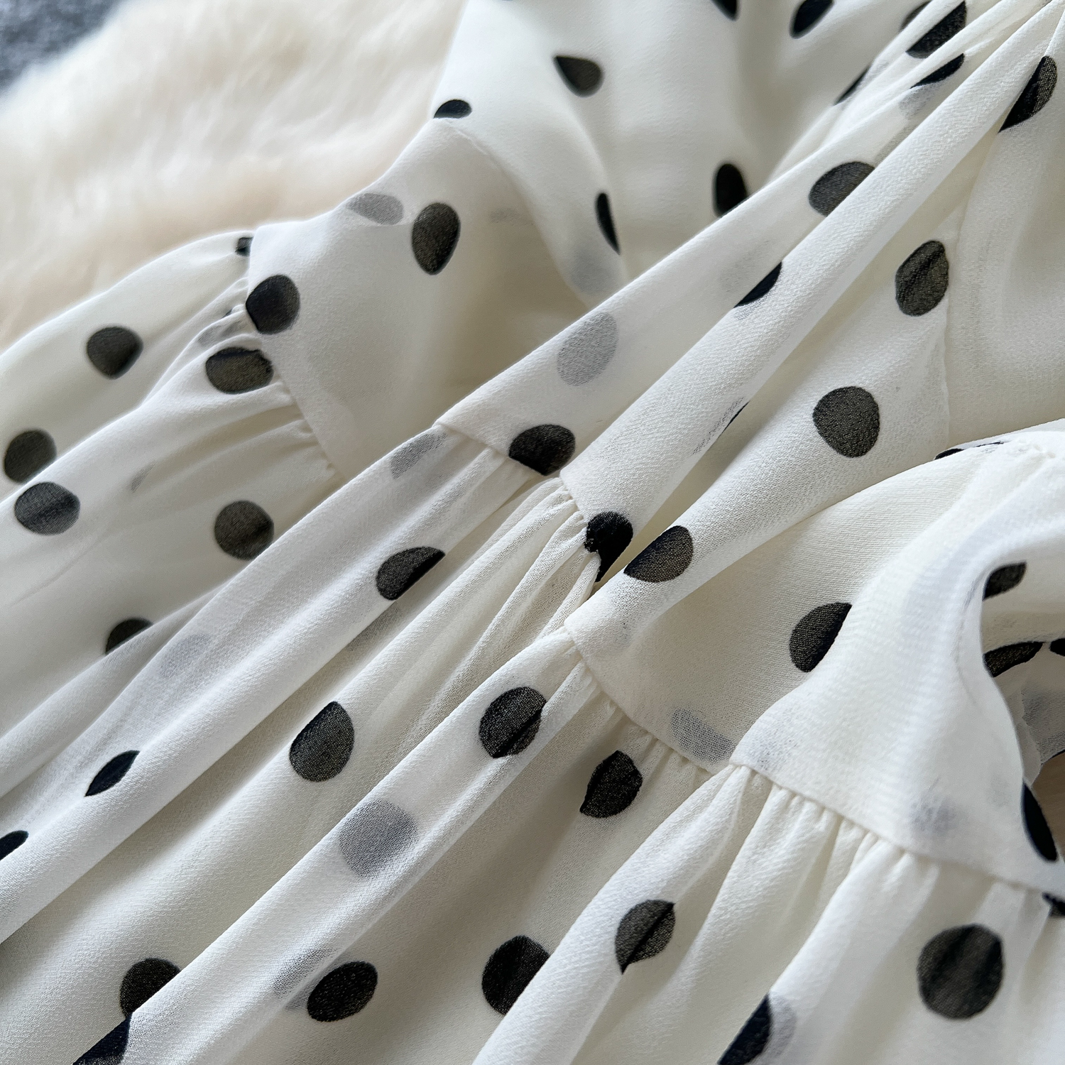 Fabric: 100% Polyester Fiber. Step into effortless style with our exquisite V-neck pleated ruffle sleeves waist-slimming French polka dot chiffon dress. Crafted with precision and attention to detail, this dress blends timeless sophistication with modern charm. The delicate chiffon fabric, adorned with classic polka dots, ensures lightweight comfort while elevating your look for any occasion. It's a perfect choice for both formal gatherings and casual outings, offering versatility and elegance in equal measure.
