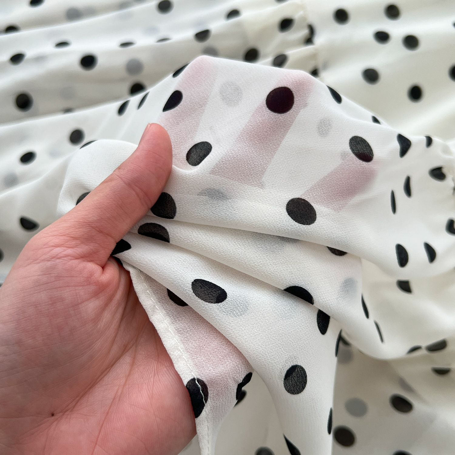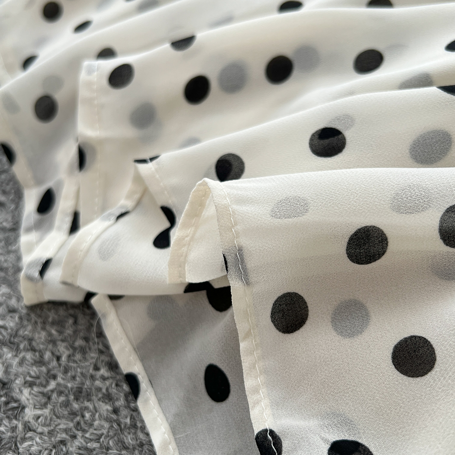 Inspired by French fashion, this polka dot chiffon dress embraces a classic aesthetic with a contemporary twist. Soft pleats and delicate ruffle sleeves make it a harmonious blend of tradition and trend, perfect for women seeking timeless wardrobe staples. Stylish, durable, and easy to accessorize, this dress is a must-have for your collection, inviting compliments wherever you go. With its refined textures and tailored design, you’ll radiate confidence and class effortlessly.